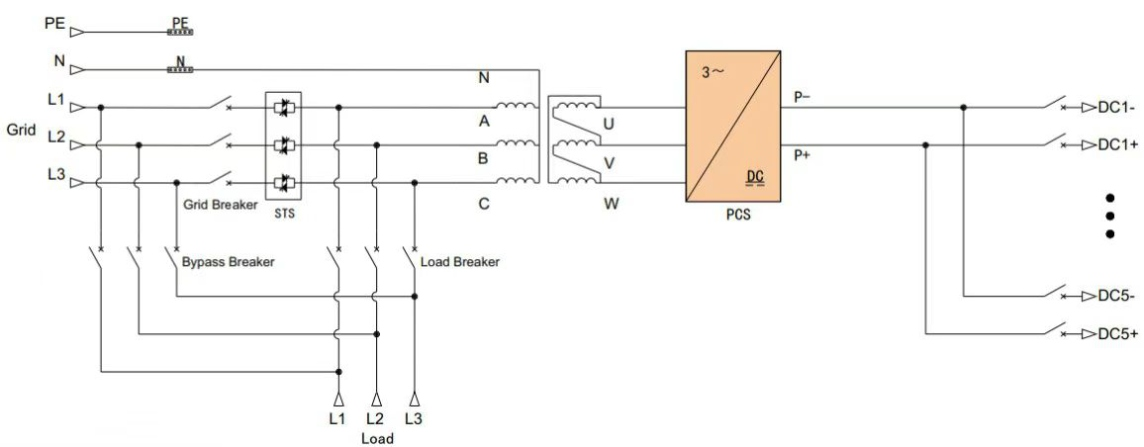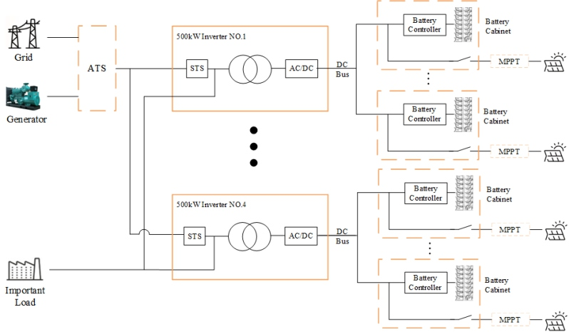 2. Когато работите с множество 500 kW системи паралелно и разпространявате STSacross различни 500 kW инвертори, е изключително важно да се гарантира, че дължината на кабела от точката на свързване на мрежата до точката на свързване на товара е последователна;