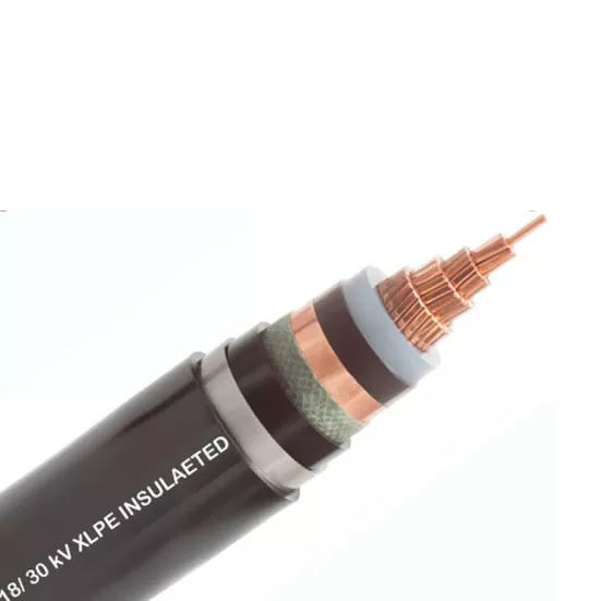 Усукан кръгъл уплътнен меден или алуминиев проводник с полупроводников слой като проводников екран, изолиран от XLPE, и полупроводников слой като неметален изолационен екран, медна лента или тел като метален изолационен екран. PVC обвивка. Отговаря на IEC 60502.